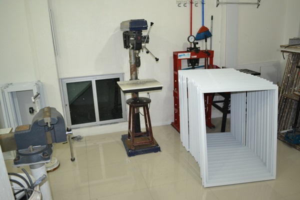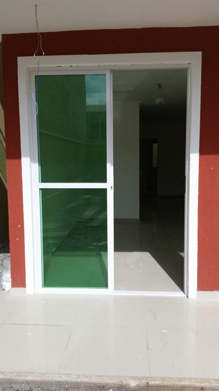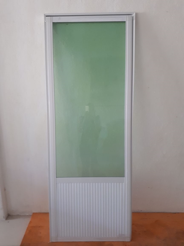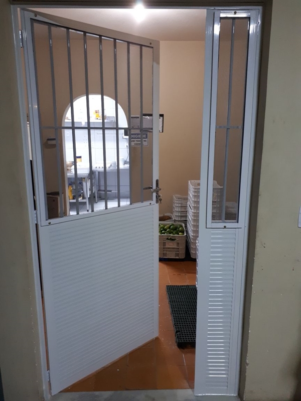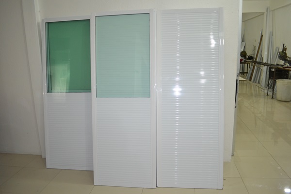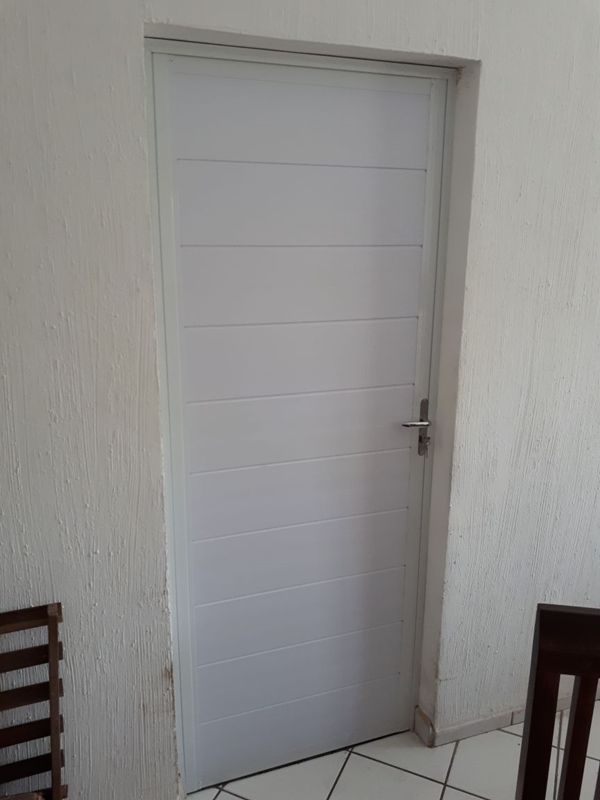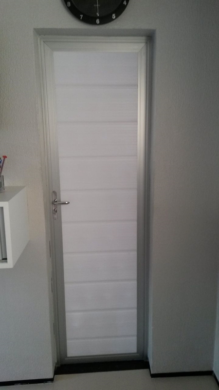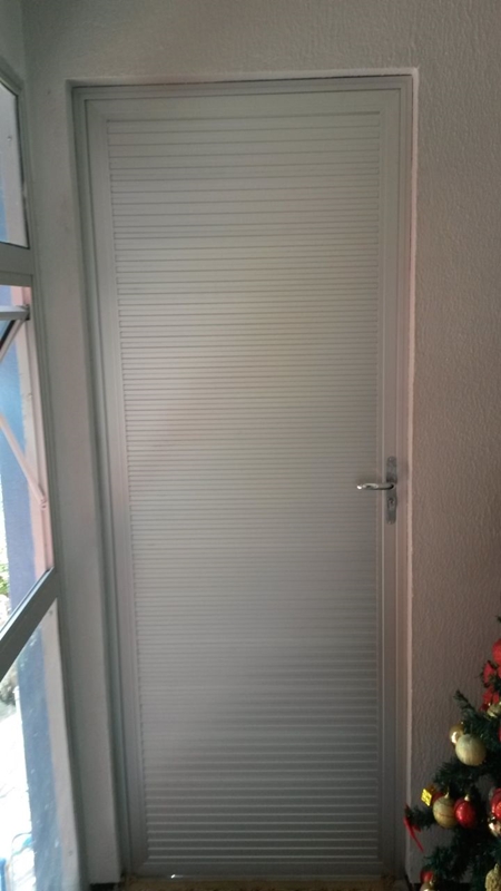 Portas em esquadrias de alumínio com acabamento em Lambri, Vidro e PVC.